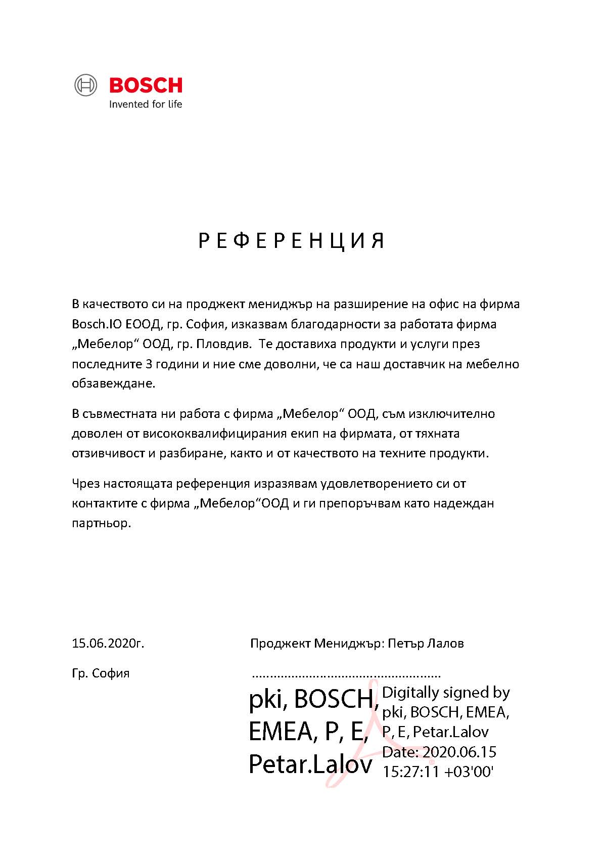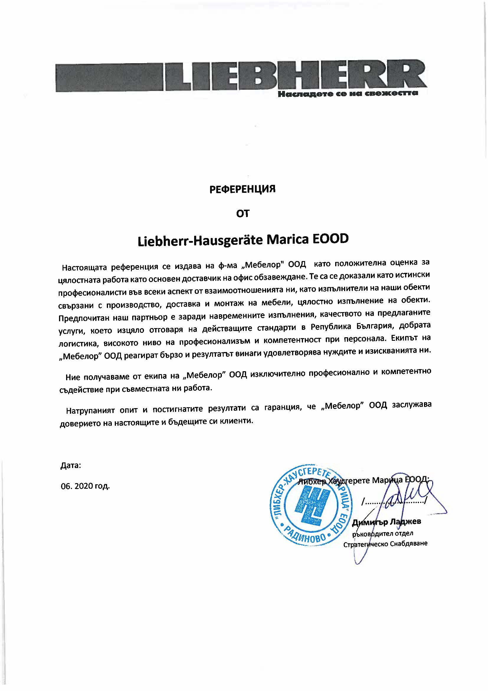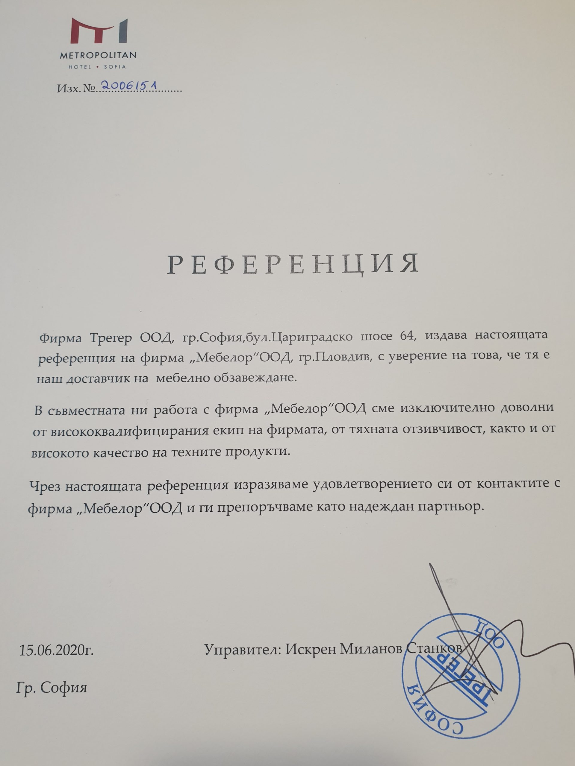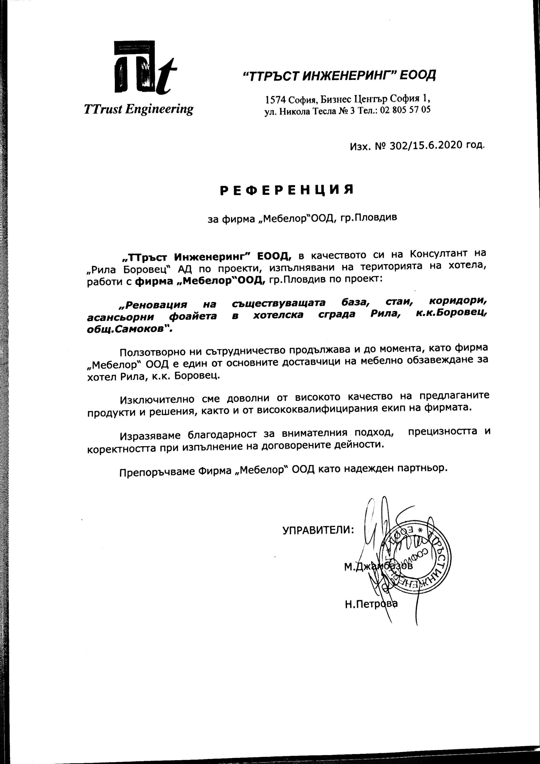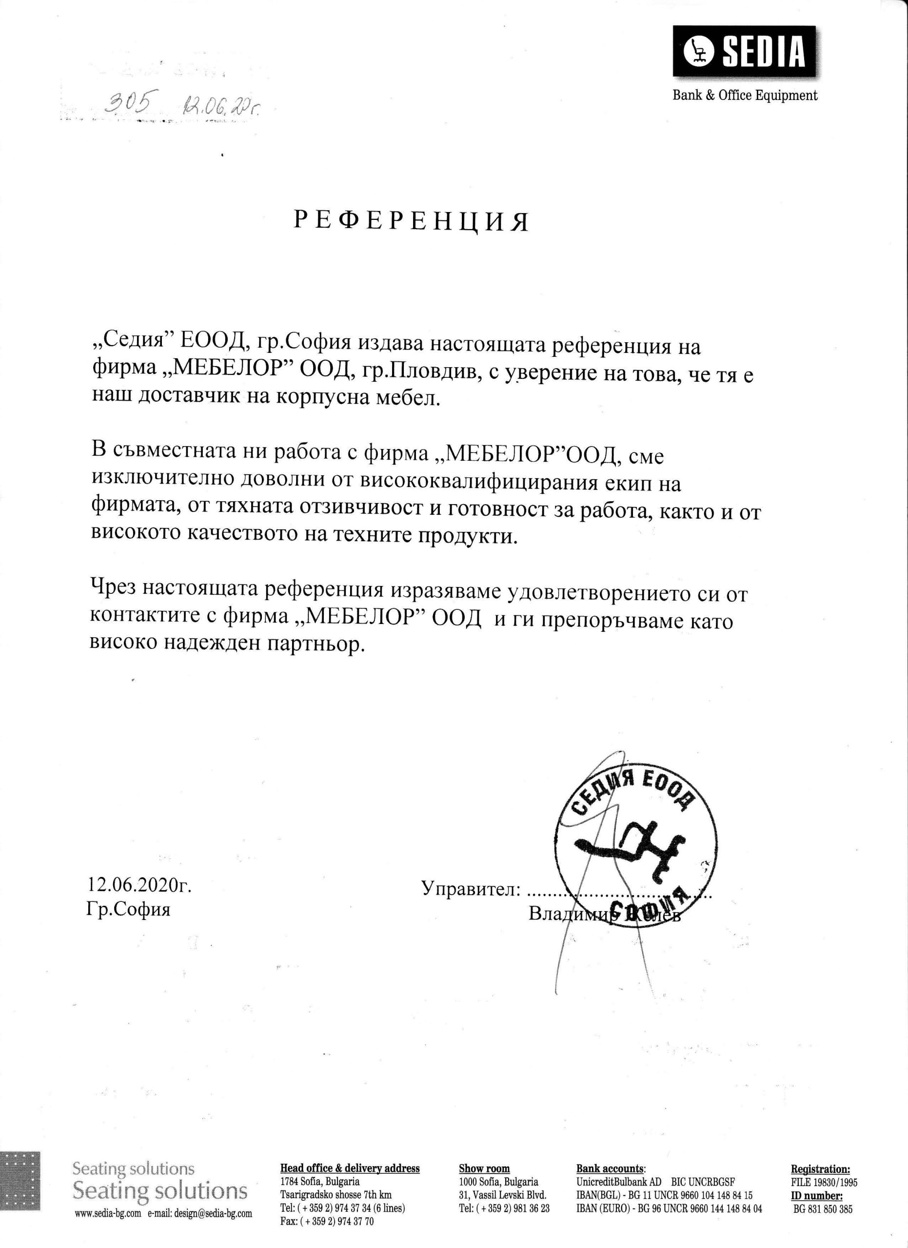 ”Мебелор” ООД е амбициозна фирма със стремеж към развитие на иновативни технологии и създаване на нови, модерни и уникални продукти, чертаещи новите тенденции в дизайна. Прецизност, качество и съвършенство в детайлите – това е нашето мото. Ние разполагаме с технологично оборудване, квалифицирани специалисти и необходимите ресурси да посрещнем всякакви предизвикателства. В потвърждение на безупречното качество при работa и сътрудничество, фирма „Мебелор” има издадени следните референции и препоръки от възложители и партньори: