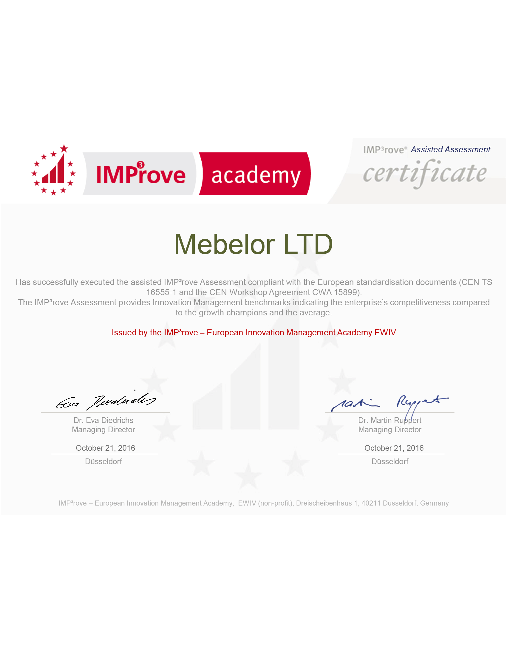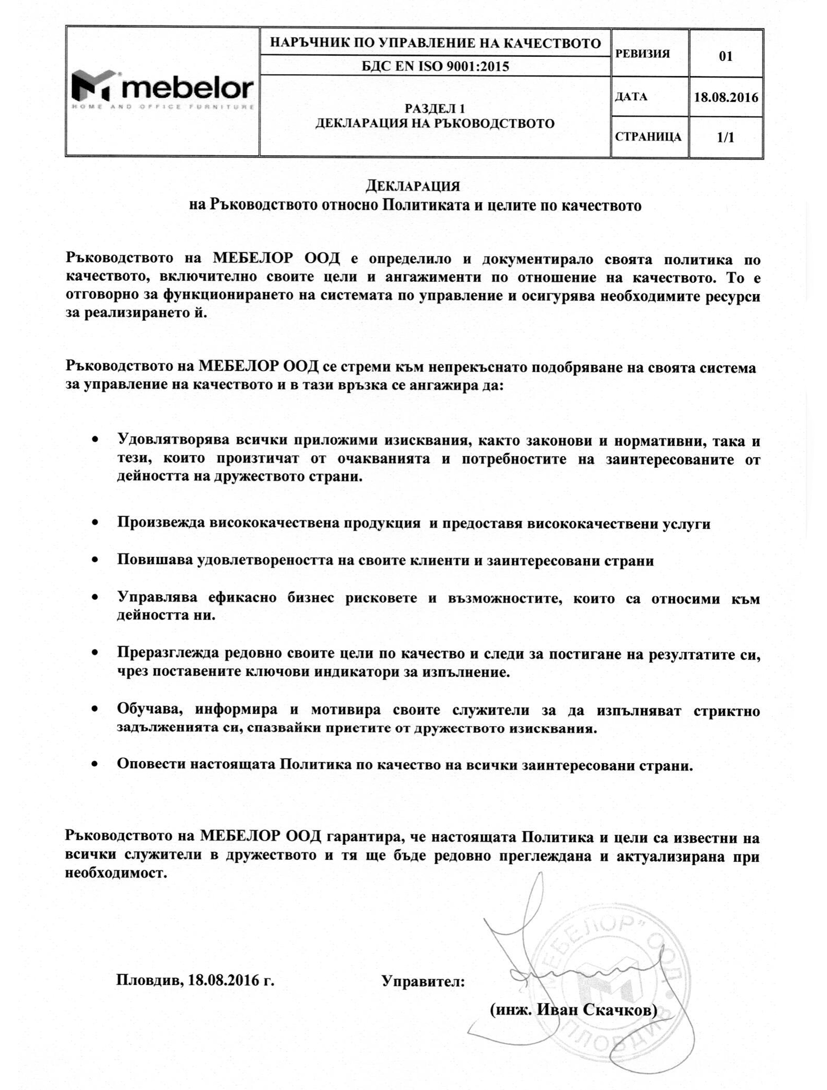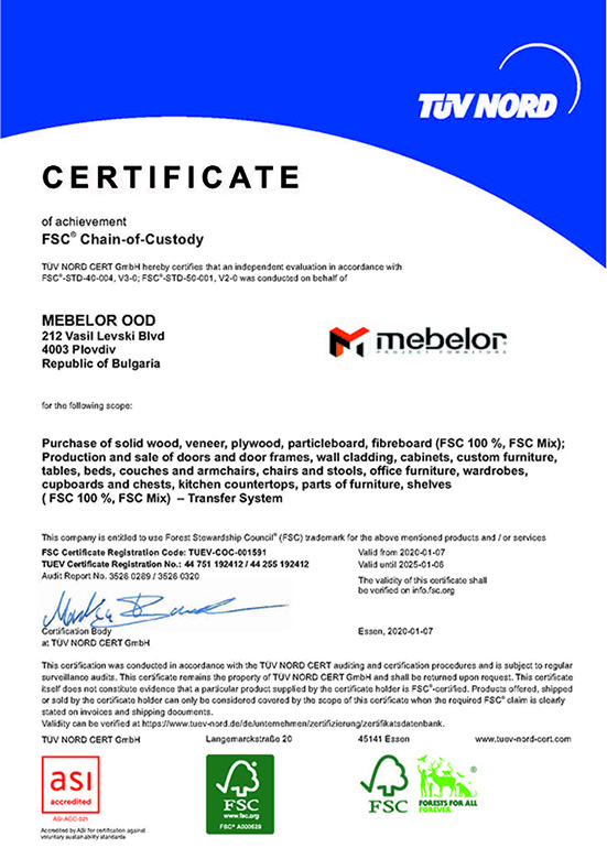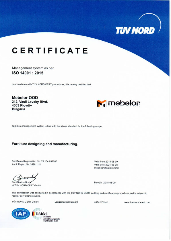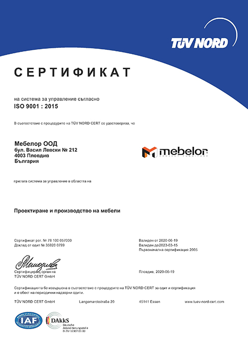 Фирма Мебелор извършва своята дейност съгласно приетите международни норми и правила, което е удостоверено с приложените сертификати: